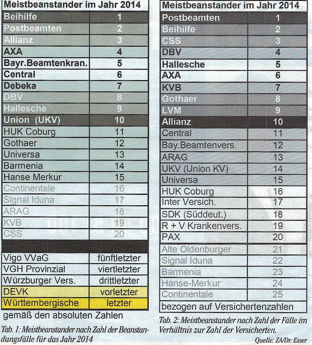 Wenn Sie Probleme mit Ihrer Versicherung oder Beihilfe haben, dann sind Sie nicht alleine. Schauen Sie sich diese Tabelle an: